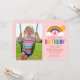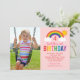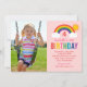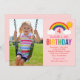 Esta súper adorable invitación a la fiesta de cumpleaños del chica incluye un colorido y brillante diseño arcoiris con nubes esponjosas y sol de verano, así como espacio para subir una foto de su hijo. Fondo rosa claro con colores arcoiris cincelados: rojo, naranja, amarillo, rosa caliente, verde, verde azulado, azul real y violeta.