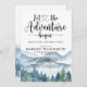 Que la aventura comience la invitación a la fiesta de cumpleaños acuarela con el paisaje silvestre de bosque y montañas con tipografía de escritura caligráfica. Un tema rústico de aventura forestal.