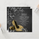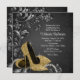 Invitación a la fiesta de cumpleaños de mujeres negras y doradas con zapatos de tacón altos de oro de bonito y perlas en un hermoso fondo de remolino negro. Esta elegante invitación de fiesta de cumpleaños en negro y oro se personaliza fácilmente para tu evento simplemente agregando tus detalles en el estilo de letra y color, y la redacción de tu elección.