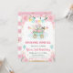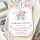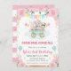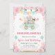 Flores rosa color de agua y diseño de trenes y animales de circo con elefantes, pandas y conejos, globos, racimos, confituras, confeti y purpurinas de oro bordes de confeti y rayas rosas de fondo