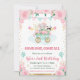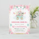 Flores rosa color de agua y diseño de trenes y animales de circo con elefantes, pandas y conejos, globos, racimos, confituras, confeti y purpurinas de oro bordes de confeti y rayas rosas de fondo