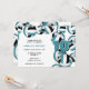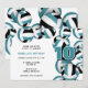 Esta invitación a la fiesta temática del voleibol incluye bolas de voleibol verde azuladas, negras y blancas agrupadas en los bordes derecho y superior del frente y un solo clúster que cubre la parte posterior de la invitación - personalizar los detalles del fiesta en la coordinación de colores sobre un fondo blanco - de katz_d_zynes
