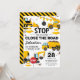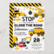Invitaciones a fiestas de cumpleaños con temas de construcción con un simple fondo blanco, con lindos ilustraciones personalizados de aferrarse, carteles de stop, un camión de basura, una excavadora, un camión de cemento, una grúa de bola que estropea la basura, manchas de suciedad y una plantilla moderna de celebración de cumpleaños para niños que es fácil de personalizar.