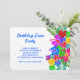 fiesta de cumpleaños de luau personalizado en brillantes colores hawaianos. Flores de hibisco tropical fluyen a un lado de esta tarjeta con texto azul acuático. Fácilmente personalizar con información fiesta para celebrar un acontecimiento histórico. Las flores son rosa caliente, morado, rojo, azul, amarillo y verde, con hojas grandes y un patrón de cuadrícula en la parte posterior en violeta brillante.