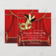 Invitación a una fiesta de cumpleaños con máscara de Mardi Gras dorada sobre un fondo de cortina roja y dorada. Esta elegante invitación de cumpleaños roja y dorada se personaliza fácilmente para su fiesta o evento agregando los detalles del evento, estilo de fuente, tamaño y color de la fuente y redacción.