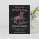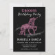Este diseño mágico seguramente complacerá a su chica que ama los unicornios para su fiesta de cumpleaños. El diseño de la invitación al cumpleaños de este chica incluye un unicornio rosa bonito con rociadores de polvo de estrellas con texto en rosa y blanco.