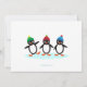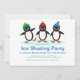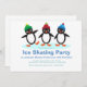 Tres lindos pingüinos con gorros de lana de colores primarios se deslizan por ahí en esta brillante y feliz invitación de cumpleaños a la fiesta de patinaje sobre hielo.