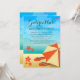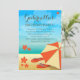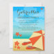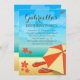 Diseño moderno para un fiesta de playa tropical o un fiesta luau para una celebración de cumpleaños. Este diseño cuenta con una sombrilla de playa naranja y crema en una playa tropical con chanclas y flores de color rojo naranja brillante con el hermoso océano azul como telón de fondo. El texto es totalmente personalizable para su propia ocasión especial.