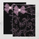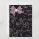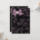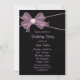 Invitación de fiesta de cumpleaños con fondo de remolinos negros y rosados con lazo rosa. Personalice la parte delantera y trasera con su elección de estilo de fuente y color de fuente.