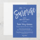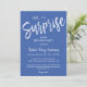 Crea una invitación de fiesta sorpresa personalizada. Esta invitación de fiesta presenta una escritura de caligrafía espaciosa y hermosa con un fondo azul yonder. Puedes personalizarlo fácilmente con tu propio texto y personalizarlo a tu gusto. Tenga en cuenta: "Shhh..." y "Sorpresa" no se pueden editar.