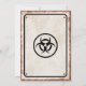 Invitación con aspecto vintage para una fiesta temática de brote de zombis con un letrero oxidado de CUIDADO, símbolo de riesgo biológico y tornillos.