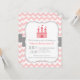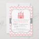 Una invitación para una fiesta de cumpleaños de la princesa con una foto de un castillo rosa con banderas voladoras y una forma cardíaca en la puerta y un elegante y elegante fondo de chevron rosa y blanco. Banner de contorno gris con centro blanco para indicar los detalles del fiesta. Esta sencilla carta de invitación con su tema rosa, blanco y gris, y el tema de la princesa, es ideal para todo aquel que esté planeando una fiesta de cumpleaños para sus preciadas niñas. Personalice los detalles de su fiesta.