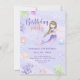 Invitación de cumpleaños temática "Bajo el mar". Los tonos pastel son acuáticos, con chica de sirena, pez payaso, cangrejo, medusas, pez estrella, burbujas de agua y corales.