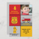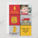 Esta invitación de la fiesta de cumpleaños del bombero ofrece una boca de incendios, un coche de bomberos, una insignia voluntaria del cuerpo de bomberos, un lugar para la foto de su niño y los campos del texto del personalizable para su información del fiesta.
