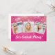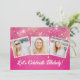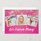 Espuelas rosas bonitos decoran esta tierna invitación a la fiesta de cumpleaños de un collage de fotos estrelladas para una mujer, adolescente o niña que ama los regalos brillantes de vidrio. Invitaciones personalizadas de feliz cumpleaños con 3 fotografías sobre un fondo de niñita rosada caliente.