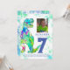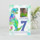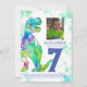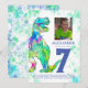 Invitación de cumpleaños de dinosaurio colorido con plantilla de foto para el niño que cumple siete años y ama los dinosaurios. Este T-Rex rugiente invita a los fanáticos de los dinosaurios a una divertida fiesta de cumpleaños número siete. Personalice esta colorida invitación de cumpleaños número 7 con salpicaduras de acuarela azul y verde con una foto del niño o niña que cumple años, el número del cumpleaños y los detalles de la fiesta y estará listo para una divertida fiesta de cumpleaños temática de dinosaurios. Todas las especies de dinosaurios son bienvenidas. Arte original único y hermoso de la artista Catherine Sweetman.