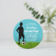 Invitación de cumpleaños redonda con temática de fútbol con un brillante fondo azul, una multitud animadora, un niño con una pelota de fútbol, una plantilla de fiesta de cumpleaños para niños que es fácil de personalizar. Al revés hay una gran pelota de fútbol.
