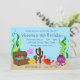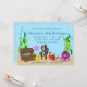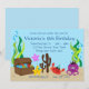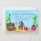 Esta encantadora invitación a la fiesta de cumpleaños de la piscina de personalizable incluye una escena bajo el mar con un cofre lleno de regalos, un pulpo y un cangrejo con gorras fiestas, y una estrella de mar sosteniendo un globo.