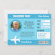 Invite a sus invitados a volar a la fiesta de cumpleaños con estas interesantes invitaciones para tarjetas de embarque! La invitación del fiesta se organiza para que parezca un billete de avión utilizando términos de aviación como tarjeta de embarque, vuelo, puerta de embarque, aeropuerto. El diseño incluye una silueta de avión de pasajeros y un código de barras simulados. Paleta de colores azul y blanco. Personaliza con detalles fiestas y foto del niño de cumpleaños!
