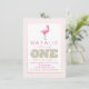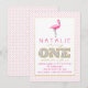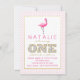 Invitación de cumpleaños del primer flamenco con flamenco rosa y letras de diamante dorado que deletrean uno en un hermoso fondo de lunares rosa y dorado. Puede personalizar fácilmente estas invitaciones de cumpleaños de flamenco rosa para su evento simplemente agregando los detalles de su evento en el estilo de fuente de su elección. Este es un diseño impreso sin verdadero foil, purpurina, diamantes, etc.