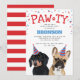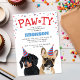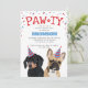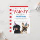 Tarjetas de invitación de fiesta de cumpleaños de perrito lindo con un bulldog francés y un dachshund, ambos con sombreros de fiesta, confeti rojo y azul, la palabra "PAW-TY", y una plantilla simple de fiesta para mascotas.