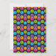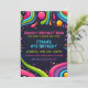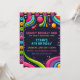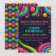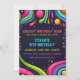 Una vibrante y divertida invitación de cumpleaños con un diseño psicodélico inspirado en el retro. El fondo oscuro está decorado con formas coloridas y giratorias, líneas abstractas y vibrantes gotas de color que recuerdan a la década de 1970. El borde es un patrón divertido de caras sonrientes multicolores, con estrellas y burbujas dispersas por todo el diseño. El texto está en una mezcla de fuentes en negrita y juguetonas, con detalles clave resaltados en azul brillante y rosa.