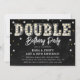 Celebre con estilo con esta rústica invitación de cumpleaños doble. El diseño incluye un fondo negro de pizarra, letras de números de bombilla y confeti. La plantilla editable es fácil de personalizar con la plantilla proporcionada.