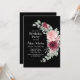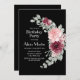 Esta elegante invitación a los cumpleaños de la flora incluye una flor de rosa de color burdeos con hojas y disposiciones de vegetación sobre un telón de fondo negro.