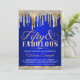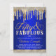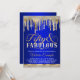 Invitación de cumpleaños cincuenta fabuloso azul real y dorado con diamantes elegantes y gotas doradas en un fondo azul real bonito. Esta invitación de cumpleaños 50 de diamante azul y dorado para mujer se personaliza fácilmente para su evento simplemente agregando sus detalles en el estilo de fuente, color y redacción de su elección.