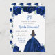 Esta invitación para la fiesta de cumpleaños incluye flores florales falsas de color azul marino purpurina y una hermosa princesa con el pelo castaño y un vestido elegante. Esto es perfecto para una fiesta de cumpleaños.