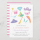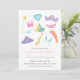Invitación a una fiesta de cumpleaños infantil con ilustraciones de artículos de vestir.