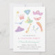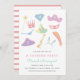 Invitación a una fiesta de cumpleaños infantil con ilustraciones de artículos de vestir.