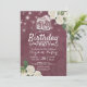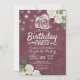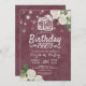 Invitación a la fiesta de cumpleaños - Guión elegante, Jarras de Mason, Flores de Hydrangea y Luces de cuerdas sobre fondo de línea floral rojo de Borgoña. Un diseño perfecto para tu gran día. ¡Todo el estilo de texto, colores, tamaños se pueden modificar para adaptarlo a sus necesidades!