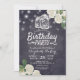 Invitación a la fiesta de cumpleaños - Guión elegante, Jarras de mason, Flores de hidrangea y luces de cuerdas sobre fondo de línea floral azul de la marina. Un diseño perfecto para tu gran día. ¡Todo el estilo de texto, colores, tamaños se pueden modificar para adaptarlo a sus necesidades!