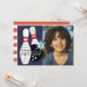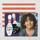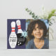 Una invitación moderna de cumpleaños para una fiesta de bolos y lugar para una foto.