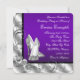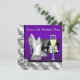 Invitación a una elegante fiesta de cumpleaños morada con zapatos de tacón alto negros y morados, bolso y copa de champán. Esta hermosa invitación de cumpleaños morada de mujer se personaliza fácilmente para su evento agregando los detalles del evento, estilo de fuente, tamaño y color de la fuente, y redacción.