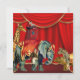 Invitación de cumpleaños de circo vintage con elefante de circo, cebra, jirafa, oso, acróbata y maestro de ceremonias sobre un fondo de cortina roja y dorada. Esta hermosa invitación de cumpleaños de circo vintage roja y dorada se personaliza fácilmente para tu fiesta o evento agregando los detalles de tu evento, estilo de fuente, tamaño y color de fuente, y redacción.