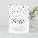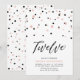 Celebra tu día especial con esta sencilla invitación de cumpleaños para niñas de 12 años. Este diseño presenta un elegante script de letra "Twelve" con confeti en forma de hexágono con una combinación de colores negro y rosa oro. Más diseños disponibles en mi tienda BaraBomDesign.