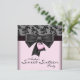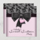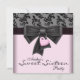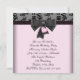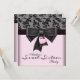Invitación a la fiesta de cumpleaños número dieciséis 16 de damasco rosa y negro con lazo de corazón rosa y negro. Se pueden solicitar piezas coordinadas por correo electrónico.