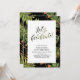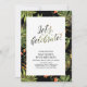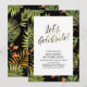 Esta invitación para fiesta de verano cuenta con tipografía elegante "¡Celebremos!" con hojas de palmera y fondo de patrón floral tropical.