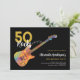 Invitaciones a la fiesta de cumpleaños número 50 con ilustración de guitarra eléctrica colorida y genial con guardapick de llama de fuego, arte de guitarra y notas musicales con tipografía de caligrafía moderna personalizada en negro y dorado "50 Rocks". Esta plantilla fácil de usar crea la invitación personalizada perfecta para celebrar cincuenta al estilo rock n roll y es ideal para un guitarrista, músico y amantes de la música. Cualquier guitarrista te dirá que nunca puedes tener demasiadas guitarras. Este diseño moderno y genial de instrumento musical celebra la energía musical de este maravilloso instrumento musical y es la forma perfecta de rockear una celebración de cumpleaños número cincuenta. Arte original de la artista Catherine Sweetman.