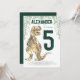 Establece el tema para celebrar a tu niño o niña amante de los dinosaurios que cumple cinco años con esta aterradora invitación de cumpleaños número 5 del dinosaurio Tyrannosaurus rex de la jungla jurásica. Fácil de personalizar con tipografía moderna de color verde oscuro con todos los detalles de la fiesta. Ilustración única del dinosaurio T-Rex y arte original de follaje de la jungla de la artista Catherine Sweetman