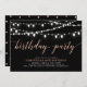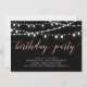 Celebra tu día especial con este elegante y moderno formulario de invitación para fiestas de cumpleaños. Este diseño presenta hermosas luces de cuerda con un tema de color negro y oro subió. Puede personalizar el texto a cualquier edad/cumpleaños de hito. En mi tienda BaraBomDesign hay más invitaciones para adultos de cumpleaños y suministros para fiestas.