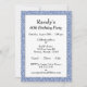 El tema de la fiesta de cumpleaños número 60 en la parte posterior es un patrón numérico aleatorio del número de hito azul 60 disperso al azar sobre un fondo blanco. La parte delantera tiene plantillas de texto para; Quién, Qué, Dónde y RSVP, enmarcado con el mismo patrón numérico que la parte posterior, pero los colores están invertidos.
