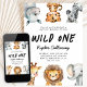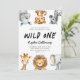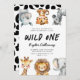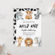 Invitación divertida y linda para la primera fiesta de cumpleaños de un niño con ilustración de animales de safari como jirafa, leopardo de las nieves, rinoceronte, león, elefante y cebra. El texto dice "Wild One". Perfecto para la fiesta del primer cumpleaños de un niño.