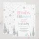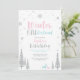 ¡Celebra tu día especial con esta moderna invitación de cumpleaños número uno de Invierno Onederland! Este diseño presenta una escena invernal con copos de nieve plateados brillantes, árboles, ciervos y una tipografía elegante "Onederland de invierno" en tema de colores rosa, azul y plateado. Invitación perfecta para una fiesta de cumpleaños de invierno para niña.