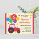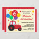 Invitación divertida de cumpleaños para niños con tema de granja/tractor. La invitación incluye un tractor rojo personalizado con globos coloridos y una edad de cumpleaños personalizado en uno de los globos. Personalizable rojo y negro invita texto. En la parte trasera hay un ilustracion de una pared de granero rojo. Perfecto para cumpleaños con temática agrícola.