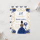 La invitación a la fiesta de cumpleaños incluye un marco dorado elegante, una bella princesa con piel oscura y un vestido azul marino, flores y un globo. Esto es perfecto para una fiesta de cumpleaños.