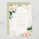 Esta verde invitación geométrica para la fiesta de cumpleaños de la quinceañera es perfecta para una fiesta de 15 años. El diseño se caracteriza por unos rosas pintados a mano, blancos, rosas y ruidosos, con un toque de vegetación, unos marcos geométricos dorados y una belleza artística inspiradora.