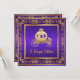 Invitación de fiesta de oro y púrpura con elegante carruaje real de oro, corona de oro en un hermoso fondo de oro y púrpura. Esta invitación con tema real se personaliza fácilmente para su evento simplemente agregando sus detalles en el estilo de fuente y color de su elección.